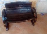 Banco feito através de rodas de ferro antigo e de tábuas de pipas